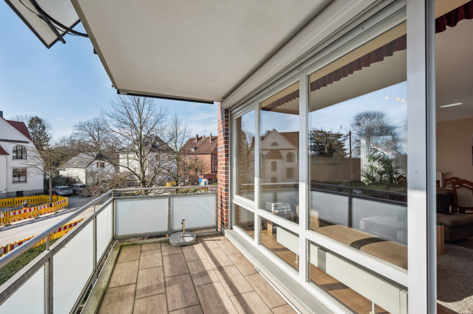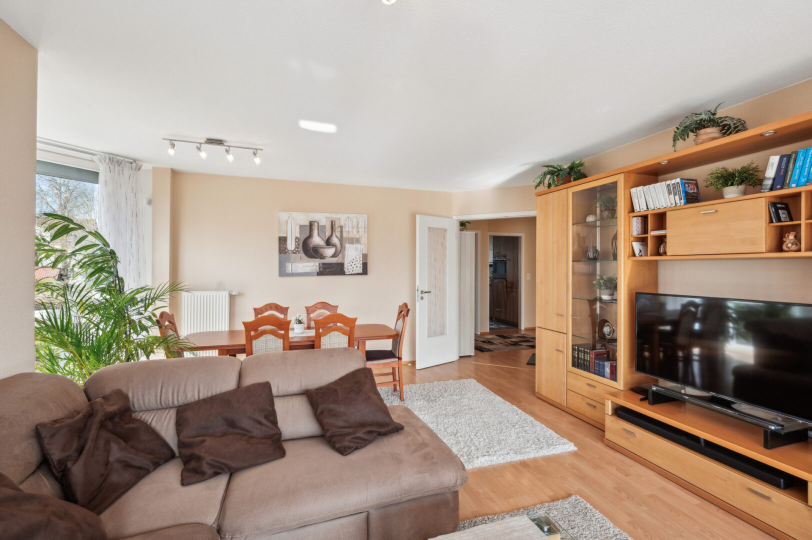 Geradeaus führt der Flur in den großzügigen Wohn- und Essbereich, der das Herzstück der Wohnung bildet. Die offene Gestaltung schafft ein angenehmes Wohngefühl, während große Fenster für eine lichtdurchflutete Atmosphäre sorgen. Hier lassen sich Wohnkomfort und Geselligkeit wunderbar vereinen. Der direkte Zugang zum Balkon erweitert den Wohnbereich nach draußen und bietet einen schönen Platz für entspannte Stunden an der frischen Luft.