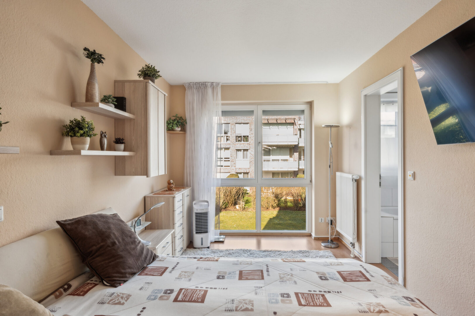 Weiter entlang des Flurs liegt das ruhige Schlafzimmer mit Zugang zu einem zweiten Badezimmer, das mit Badewanne, Waschbecken und WC ausgestattet ist – ein echter Komfortgewinn.