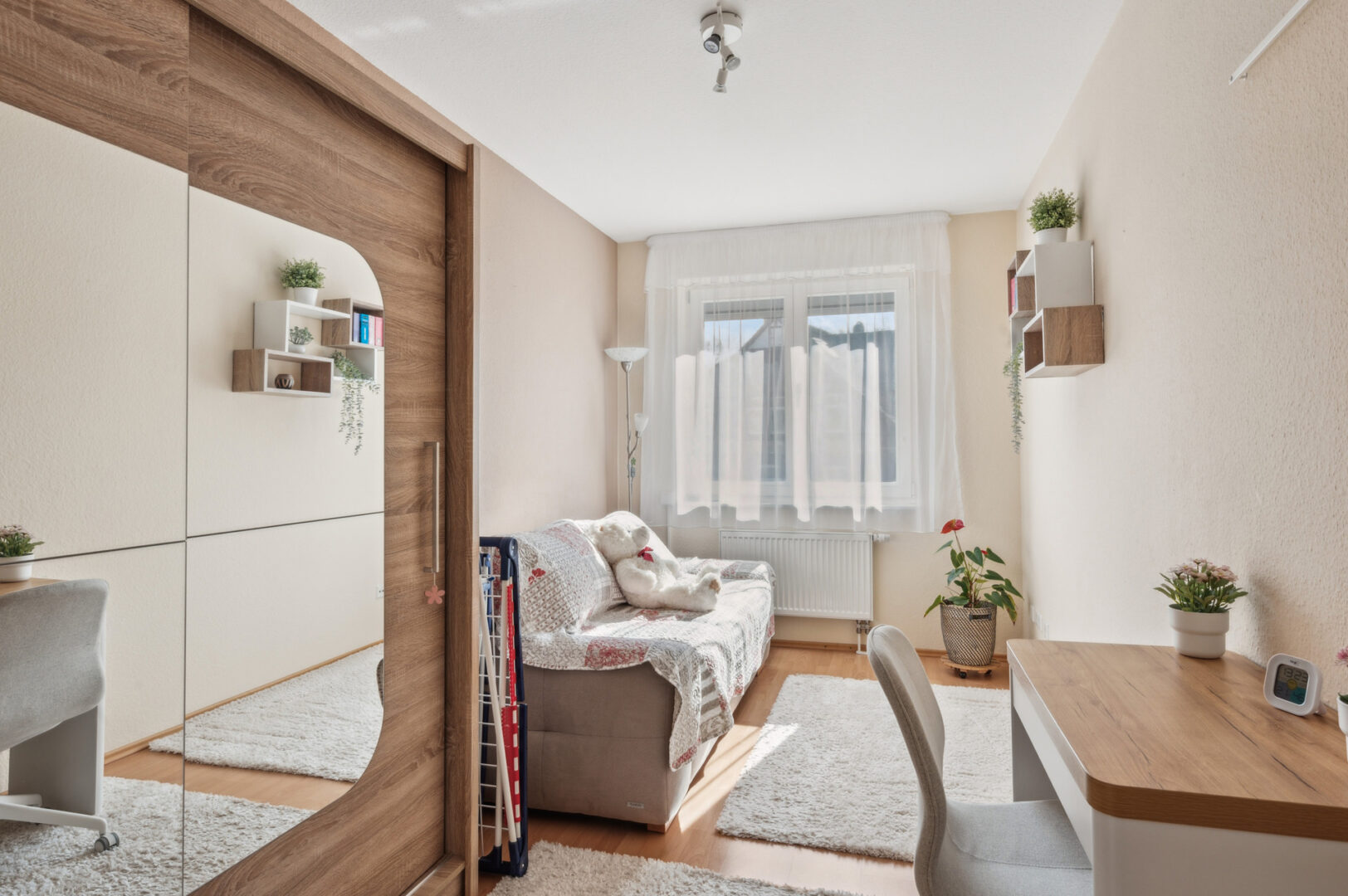 Auf der linken Seite des Flurs befinden sich zwei gut geschnittene Zimmer, die sich flexibel als Kinder-, Gäste- oder Arbeitszimmer nutzen lassen. Große Fenster sorgen hier für eine freundliche Atmosphäre und viel Tageslicht.