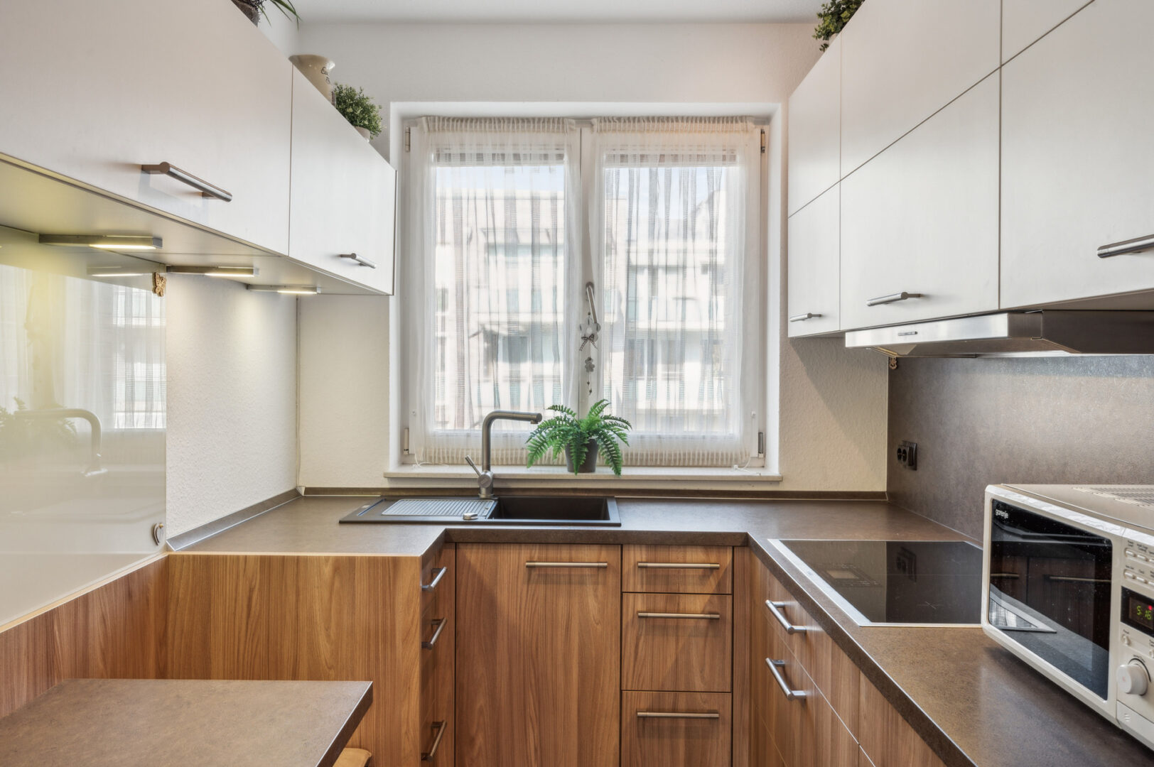 Beim Betreten der Wohnung empfängt Sie ein einladender Flur, der die einzelnen Räume miteinander verbindet. Rechterhand befindet sich die moderne Einbauküche mit gemütlicher Sitzgelegenheit – ideal für den ersten Kaffee am Morgen oder kleine Mahlzeiten zwischendurch. Direkt daneben liegt ein praktisches Badezimmer mit Dusche, Waschbecken und WC.
