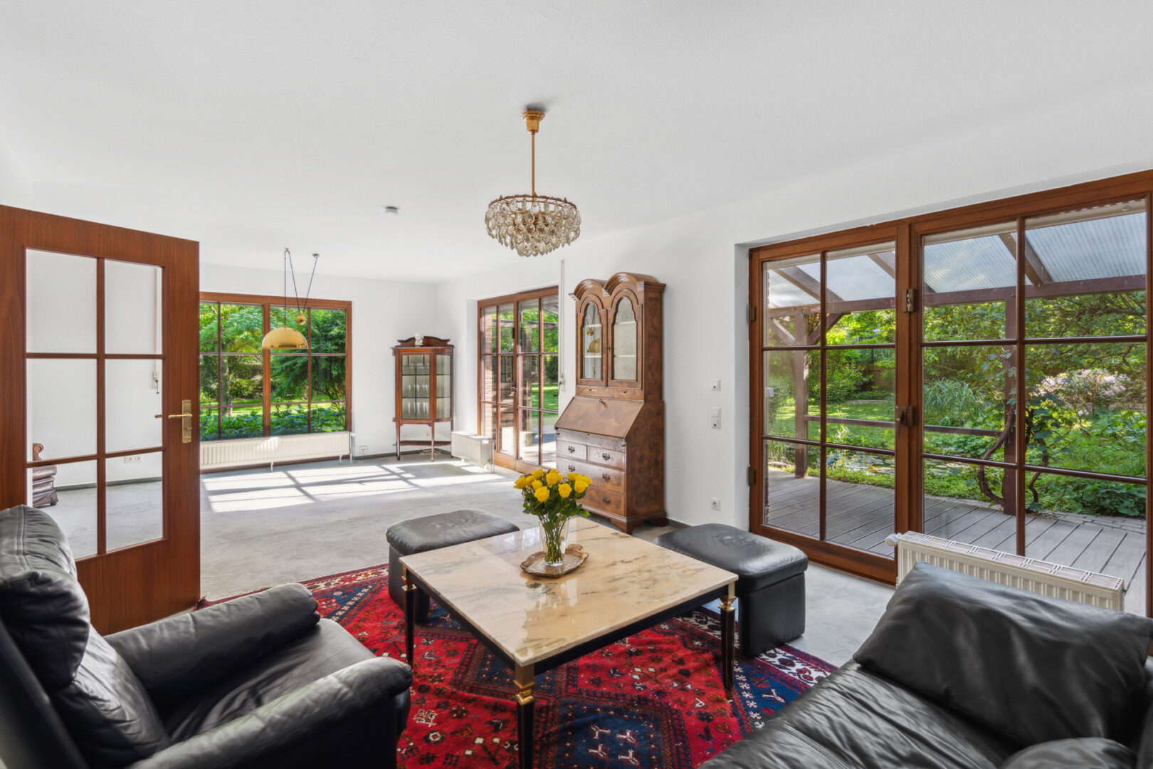 Von hier aus haben Sie Zugang auf die große Terrasse und in den wunderschönen Garten. Genießen Sie die idyllische Atmosphäre, begleitet vom Plätschern des Teichbrunnens um vom Rauschen der Bäume. Der Garten umgibt das Haus von 2 Seiten, ist mit hohen Hecken und Bepflanzung versehen und schafft so ein hohes Maß an Privatsphäre.