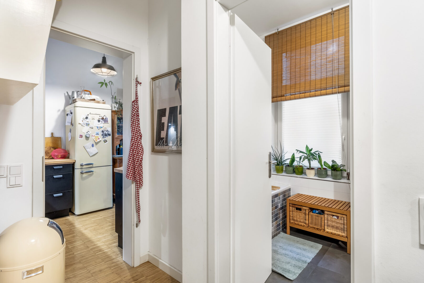 Rechterhand des Eingangs befinden sich das Badezimmer und die Küche. Das Bad ist ein echter Hingucker - 2017 vollständig modernisiert finden Sie hier eine bodentiefe Dusche, eine separate Badewanne und praktischerweise auch ein Fenster für Tageslicht und optimale Belüftung.
