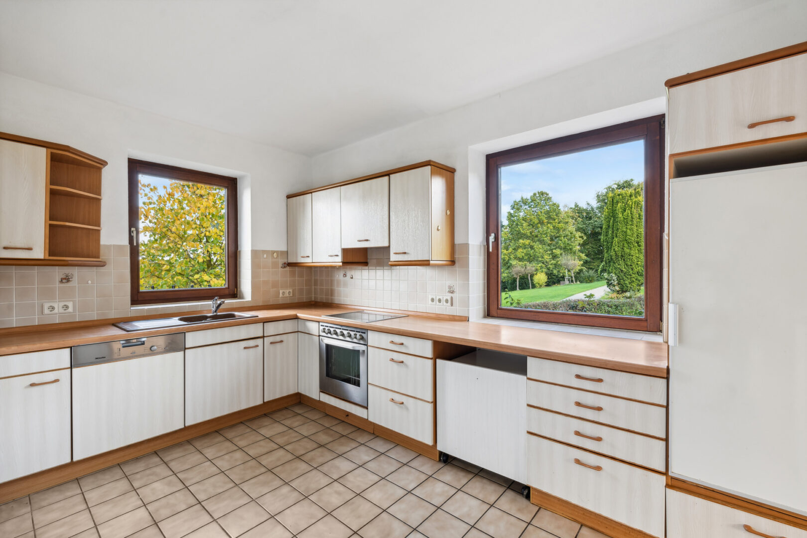 Die angrenzende Küche ist mit einer funktionalen Einbauküche ausgestattet. Die 2 Fenster sorgen auch hier für Tageslicht und frische Luft. Die Küche verfügt über sämtliche Kochmöglichkeiten und bietet zudem reichlich Staufläche.