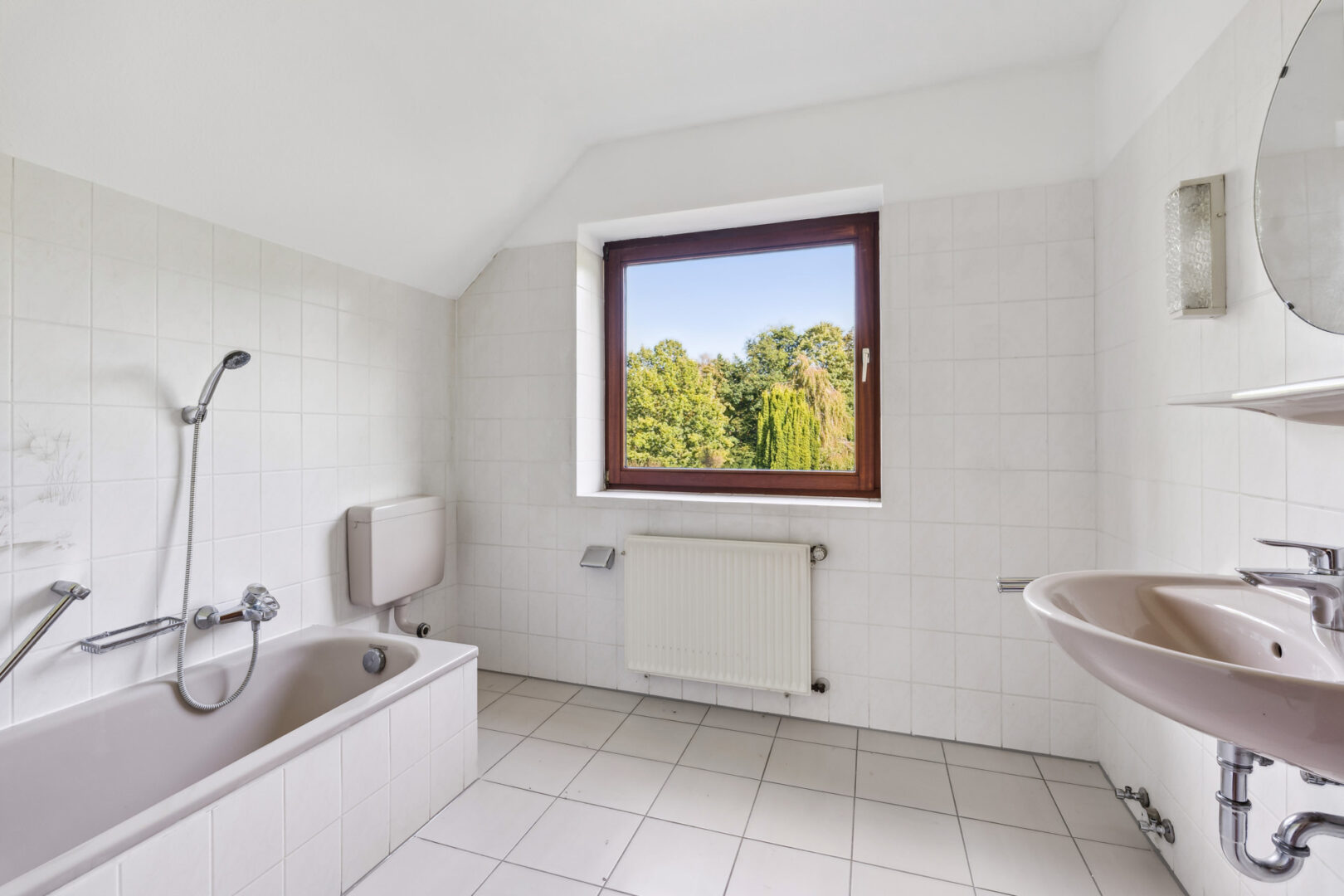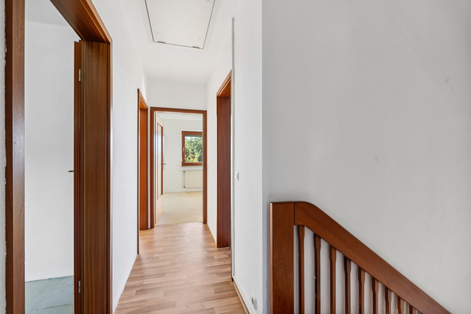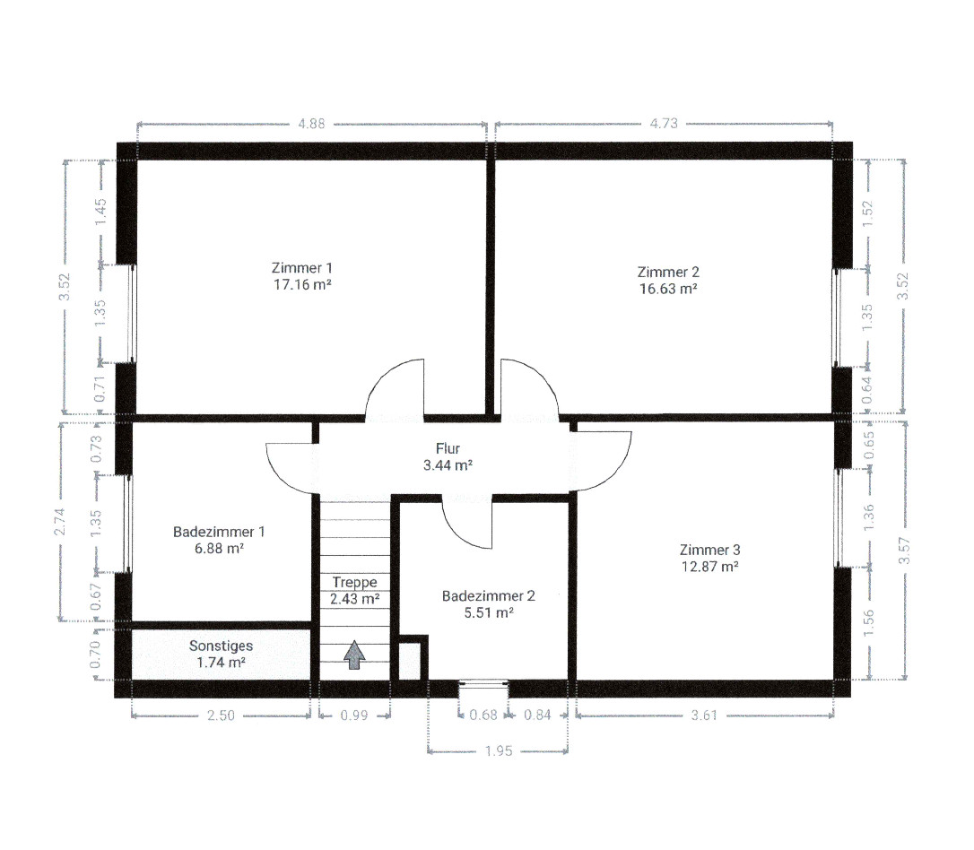Über eine Holztreppe erreichen Sie das Obergeschoss. Hier befinden sich drei ähnlich große Zimmer. Die Nutzungsarten sind ganz Ihnen überlassen - Sie eignen sich ideal als Schlafzimmer, für Ihre Kinder oder auch als Büro. Eine Besonderheit ist, dass das Haus im Obergeschoss 2 vollwertige Badezimmer hat. Das Badezimmer linkerhand des Treppenhauses hat eine Badewanne, das Bad auf der anderen Seite eine Dusche. Beide Bäder sind mit einem Fenster versehen.
