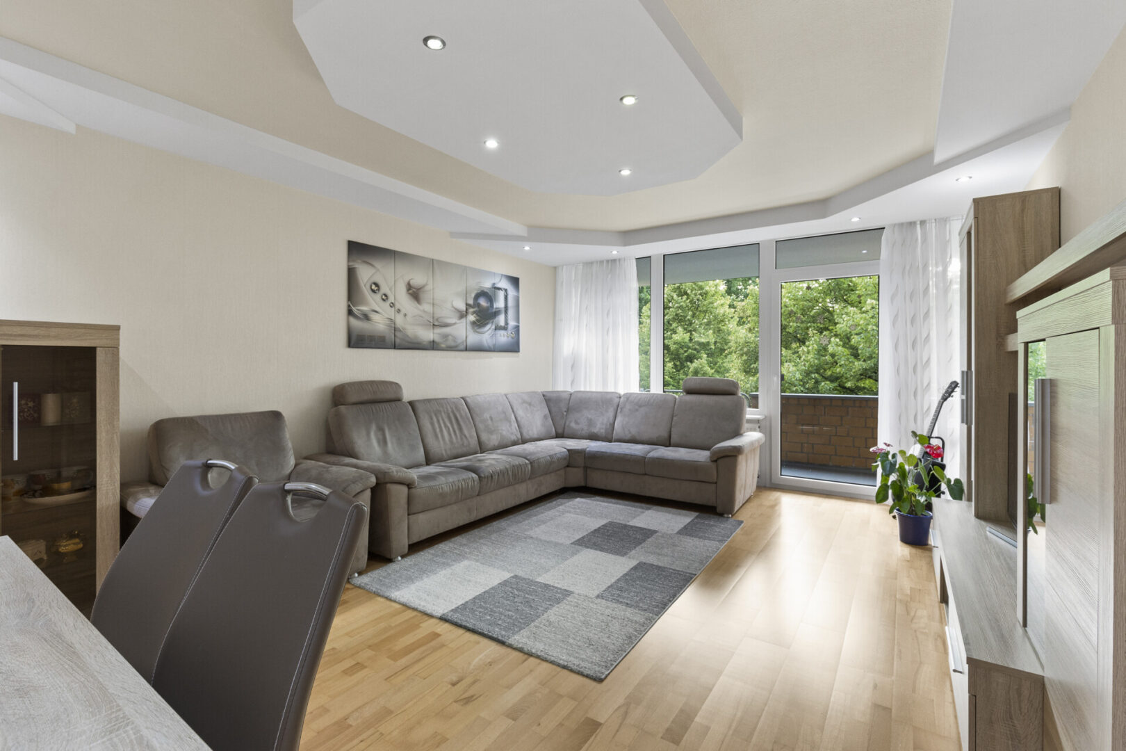 Das Wohnzimmer bildet das Zentrum der Wohnung. Es ist einladend gestaltet, bietet ausreichend Platz für eine gemütliche Wohnlandschaft und gewährt direkten Zugang zum Balkon. Dieser bietet Raum für einen kleinen Tisch, Pflanzen oder einfach ein paar ruhige Minuten an der frischen Luft – ein schöner Rückzugsort mitten im Alltag.