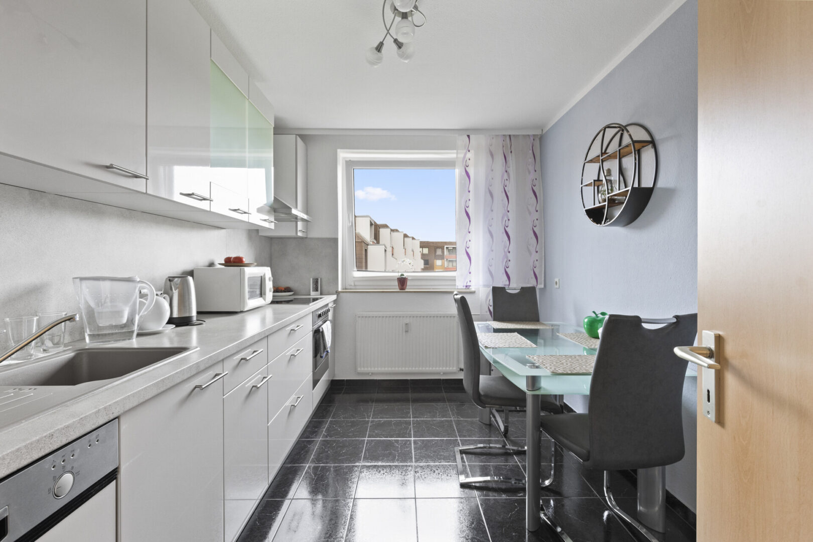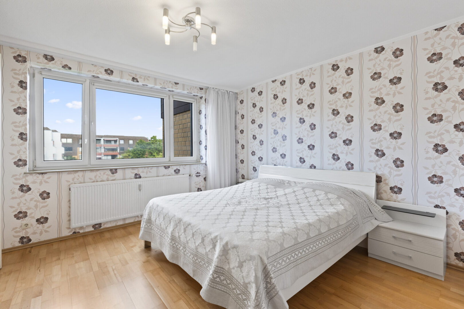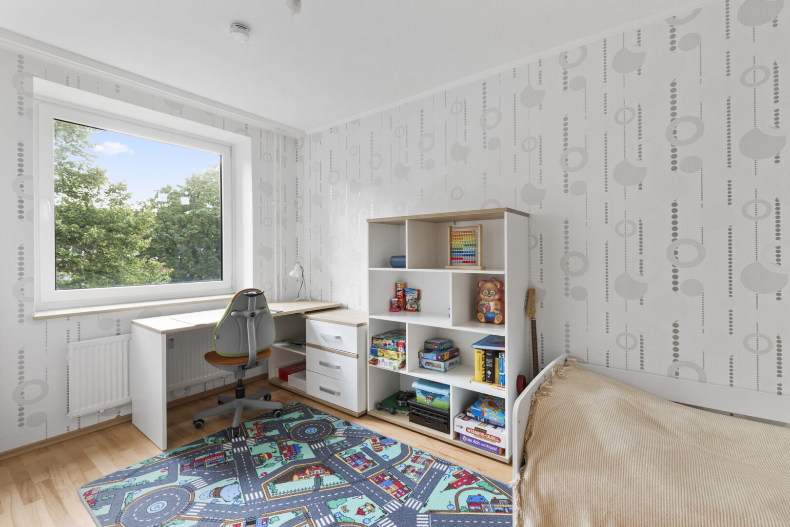 Die Küche ist mit einer gepflegten Einbauküche ausgestattet und bietet ausreichend Platz für einen Esstisch. Hier lässt sich der Tag beginnen – mit Kaffee, Zeitung oder Gesprächen mit der Familie. Direkt angrenzend befindet sich das Schlafzimmer, das ruhig gelegen ist und durch seine Nähe zum angrenzenden Badezimmer mit Badewanne zusätzlichen Komfort bietet.