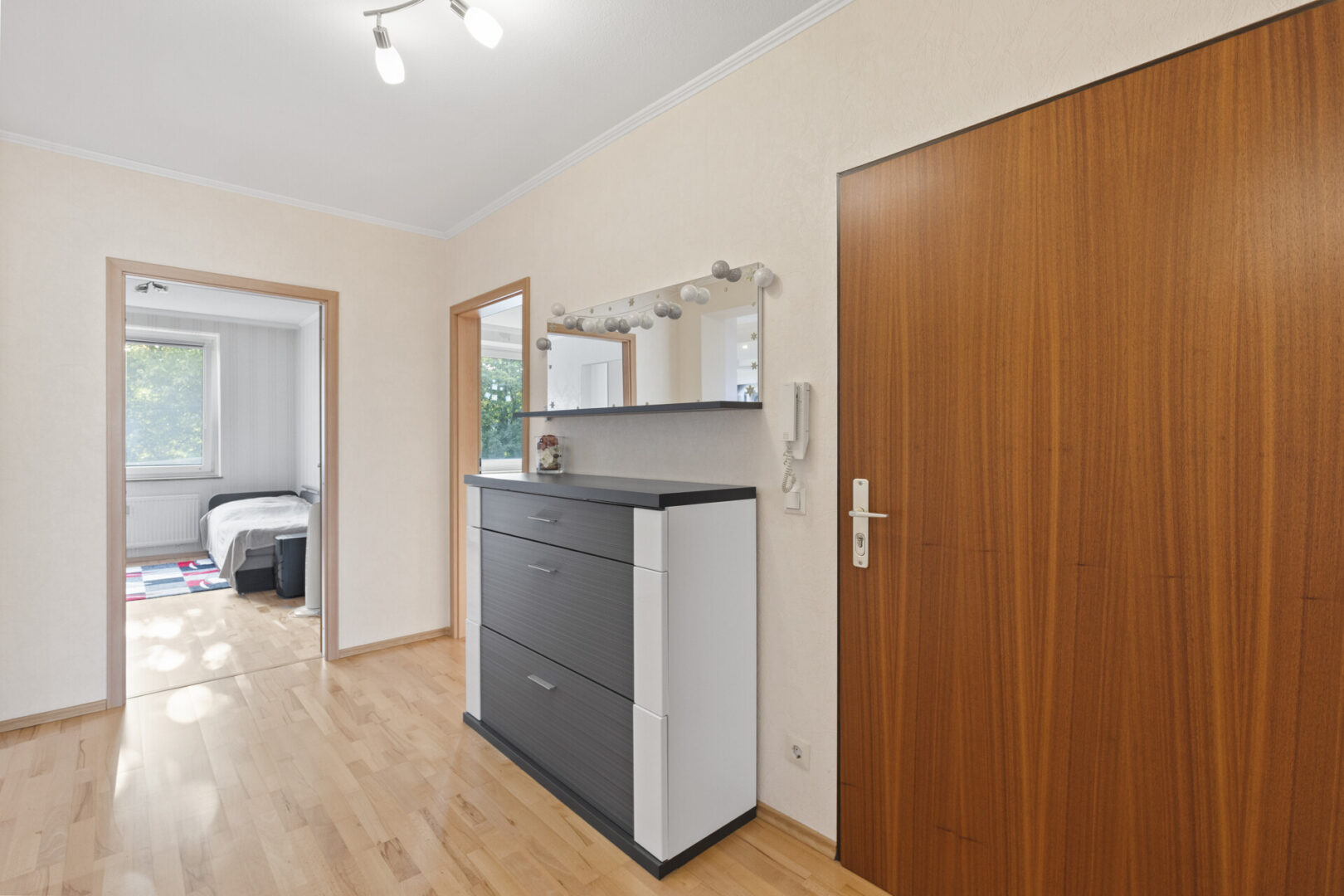 Die Wohnfläche von knapp 100 m² verteilt sich auf vier gut nutzbare Zimmer, zwei vollwertige Badezimmer sowie eine Küche mit Essplatz und einen Balkon. Beim Betreten der Wohnung gelangen Sie in einen geräumigen Flur, von dem aus alle Räume zugänglich sind. Rechter Hand befinden sich zwei flexibel nutzbare Zimmer – ideal als Kinderzimmer, Büro oder Gästezimmer. Beide Räume sind gut geschnitten, freundlich und vielseitig einrichtbar.