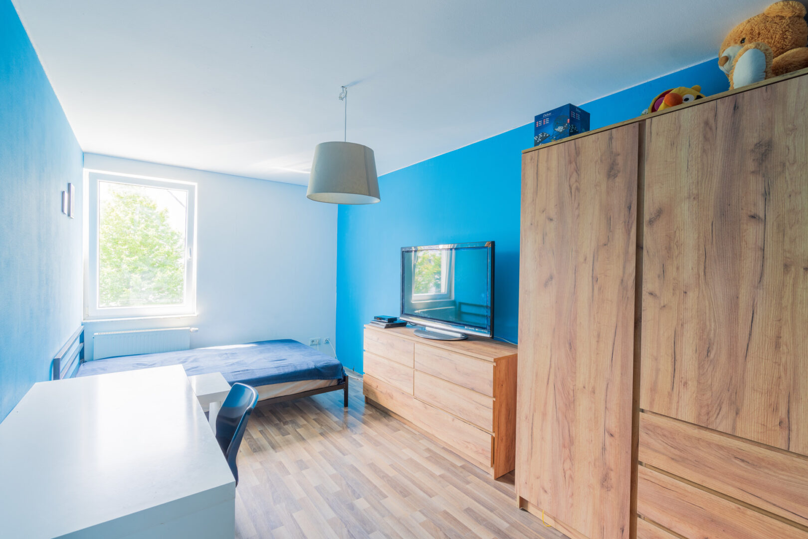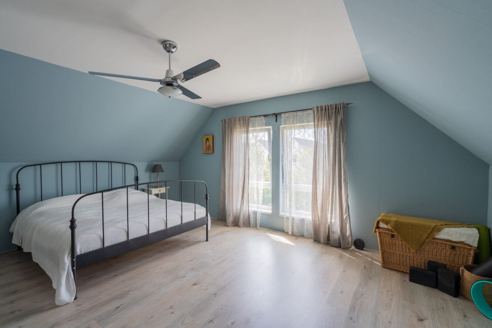 Das große Schlafzimmer mit einer Fläche von ca. 26m² bietet Ihnen viel Platz zum Platzieren Ihrer Lieblingsmöbelstücke. Von hier aus haben Sie einen schönen Blick über die Nachbarschaft.