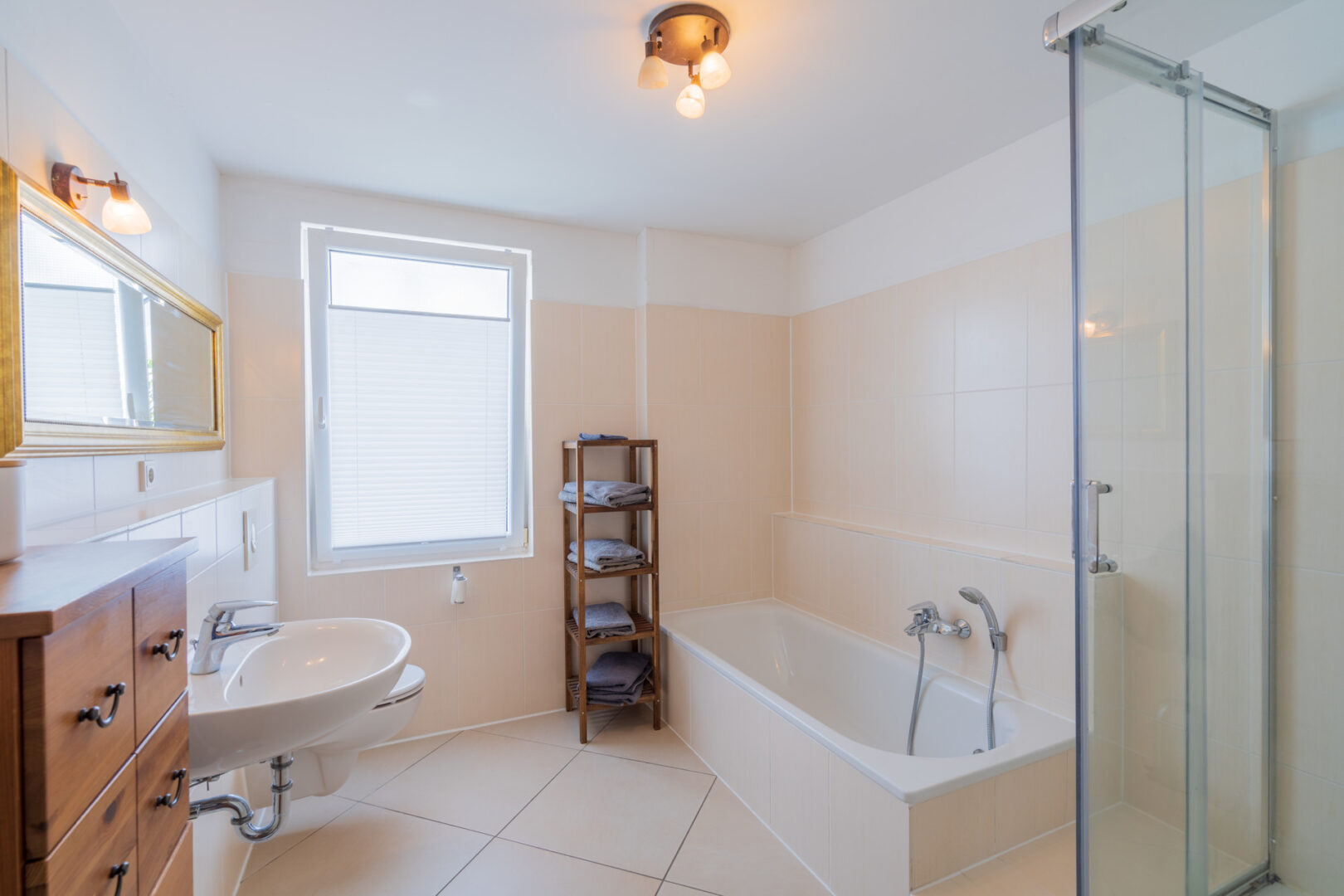 Im ersten Obergeschoss befinden sich 3 geräumige Zimmer, die alle ähnlich groß sind. Sie eignen sich ideal als Kinder-/ Schlaf-/ Gäste-/ oder Arbeitszimmer. Des Weiteren liegt hier das große Tageslicht-Badezimmer, ausgestattet mit einer großen Badewanne und einer separaten Dusche.