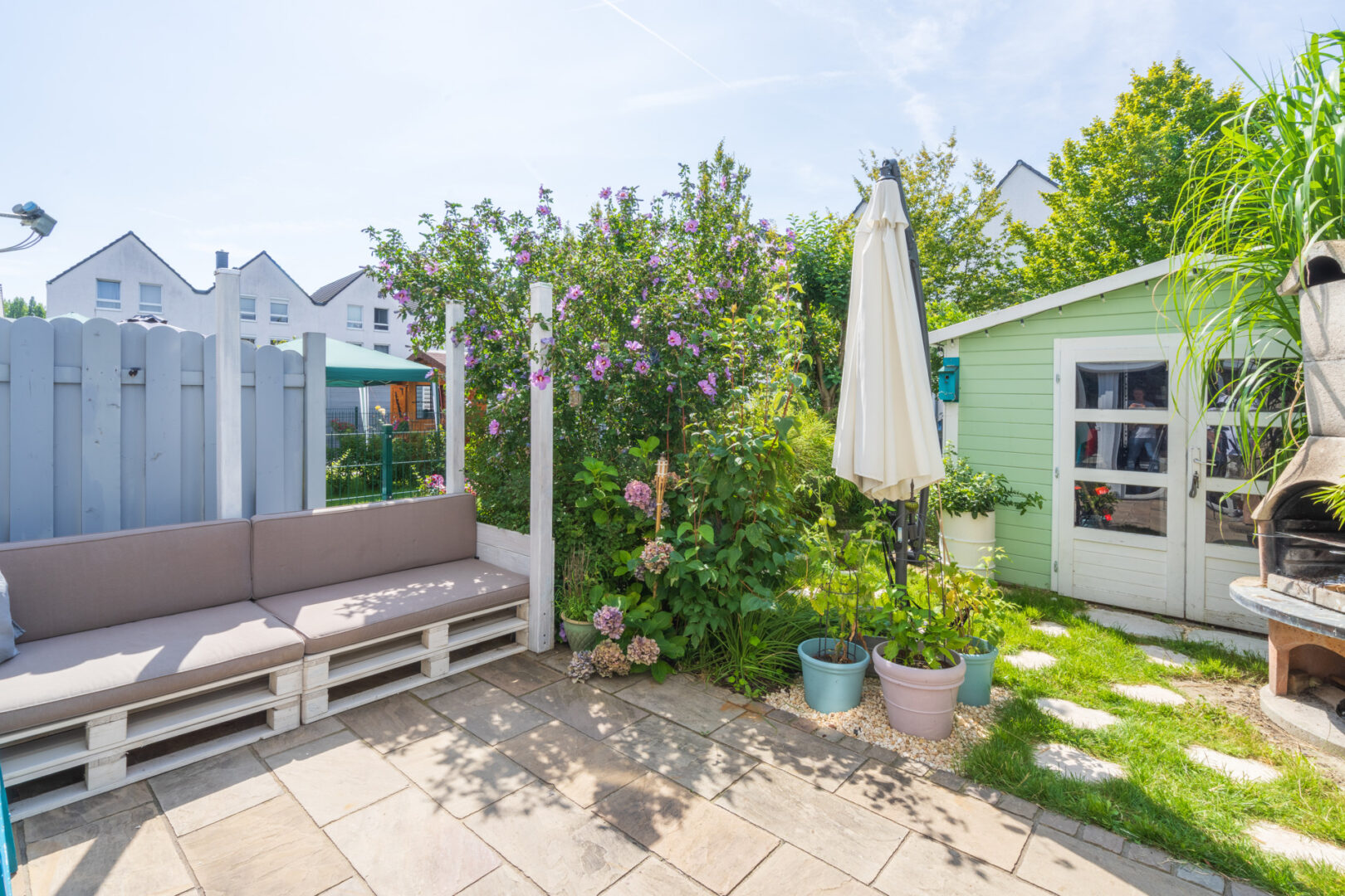Eine hochwertige und offene Küche gehört ebenfalls zum Haus. Sie lädt zum Herrichten von Speisen ein und bietet ausreichend Staufläche. Vom Wohnzimmer aus erfolgt der Zugang in den gemütlichen Garten mit der Naturstein-Terrasse. Hier steht ein kleines Häuschen, welches zusätzlichen Stauraum bietet. Genießen Sie hier im Garten die Zeit mit Ihren Liebsten!