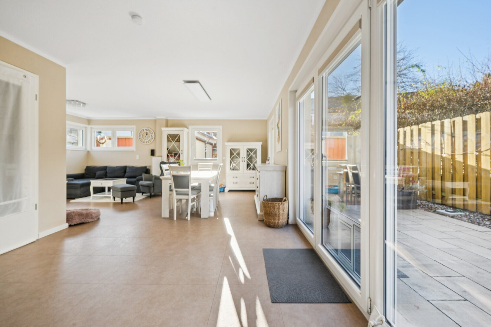 Der weitläufige Wohn- und Essbereich öffnet sich in einem harmonischen L-Grundriss und wird durch große, teils bodentiefe Fensterflächen mit Licht geflutet. Die angrenzende offene Küche ist hochwertig ausgestattet und fügt sich ideal in das moderne Wohnkonzept ein. Der Zugang zur Terrasse mit elektrischer Markise schafft einen fließenden Übergang in den ersten, direkt am Haus gelegenen Gartenbereich inkl. einem Schuppen – kompakt, gepflegt und gemütlich. Ergänzend gehört zur Immobilie ein weiterer Gartenanteil, der sich hinter der rückwärtigen Bebauung befindet und bisher gemeinsam mit dem Elternhaus genutzt wurde.