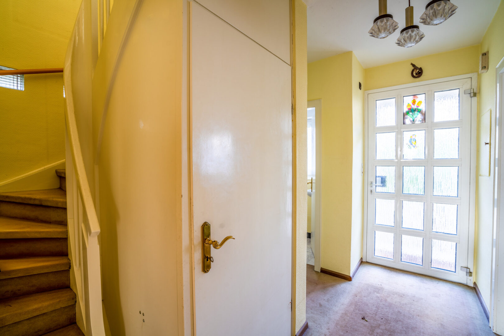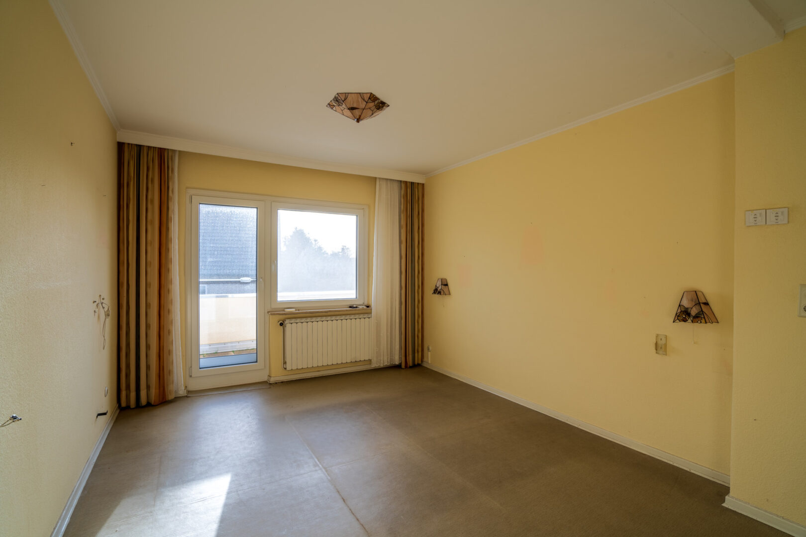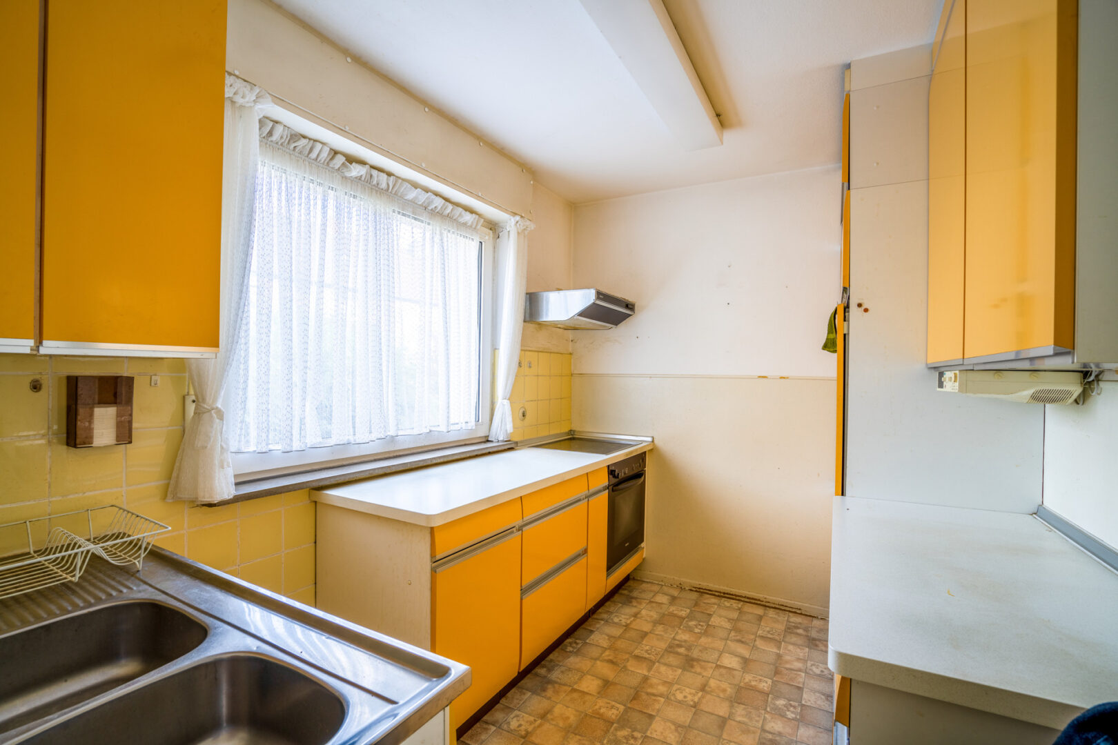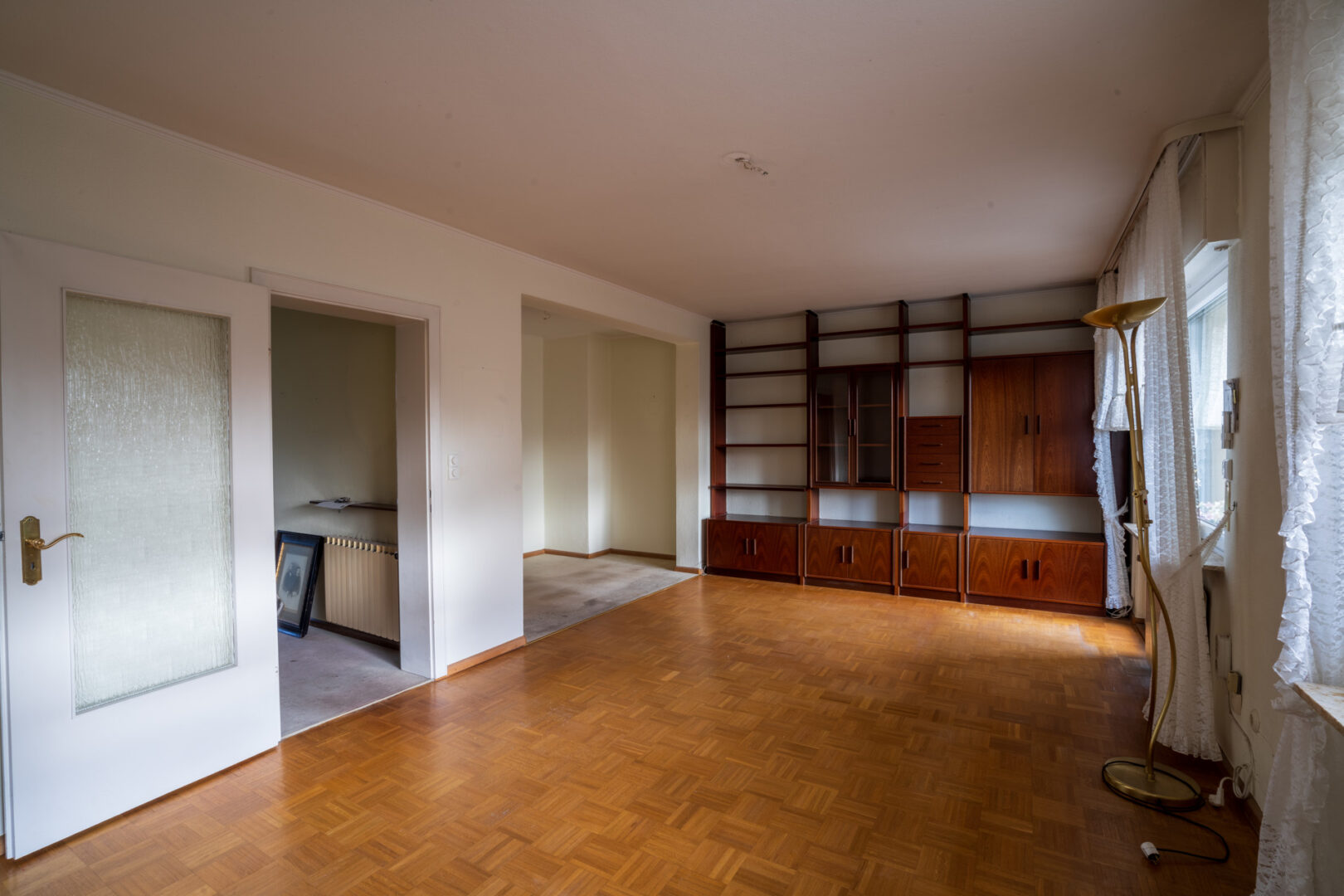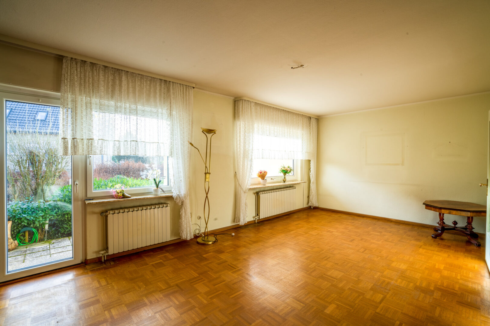 Der Eingangsbereich führt Sie zunächst in die Küche auf der linken Seite, rechts befindet sich ein Gäste-WC mit Fenster. Geradeaus öffnet sich der großzügige Wohnbereich mit Zugang zur Terrasse und in den Garten. Der Raum wirkt durch die großen Fenster angenehm hell und bietet mit einer geräumigen Nische vielfältige Einrichtungsmöglichkeiten – etwa als Essbereich. Der vorhandene Bodenbelag kann nach eigenem Geschmack erneuert werden, was Ihnen Spielraum für die Gestaltung gibt. Eine Öffnung der Wand zur Küche könnte eine großzügige Wohnküche ermöglichen.
