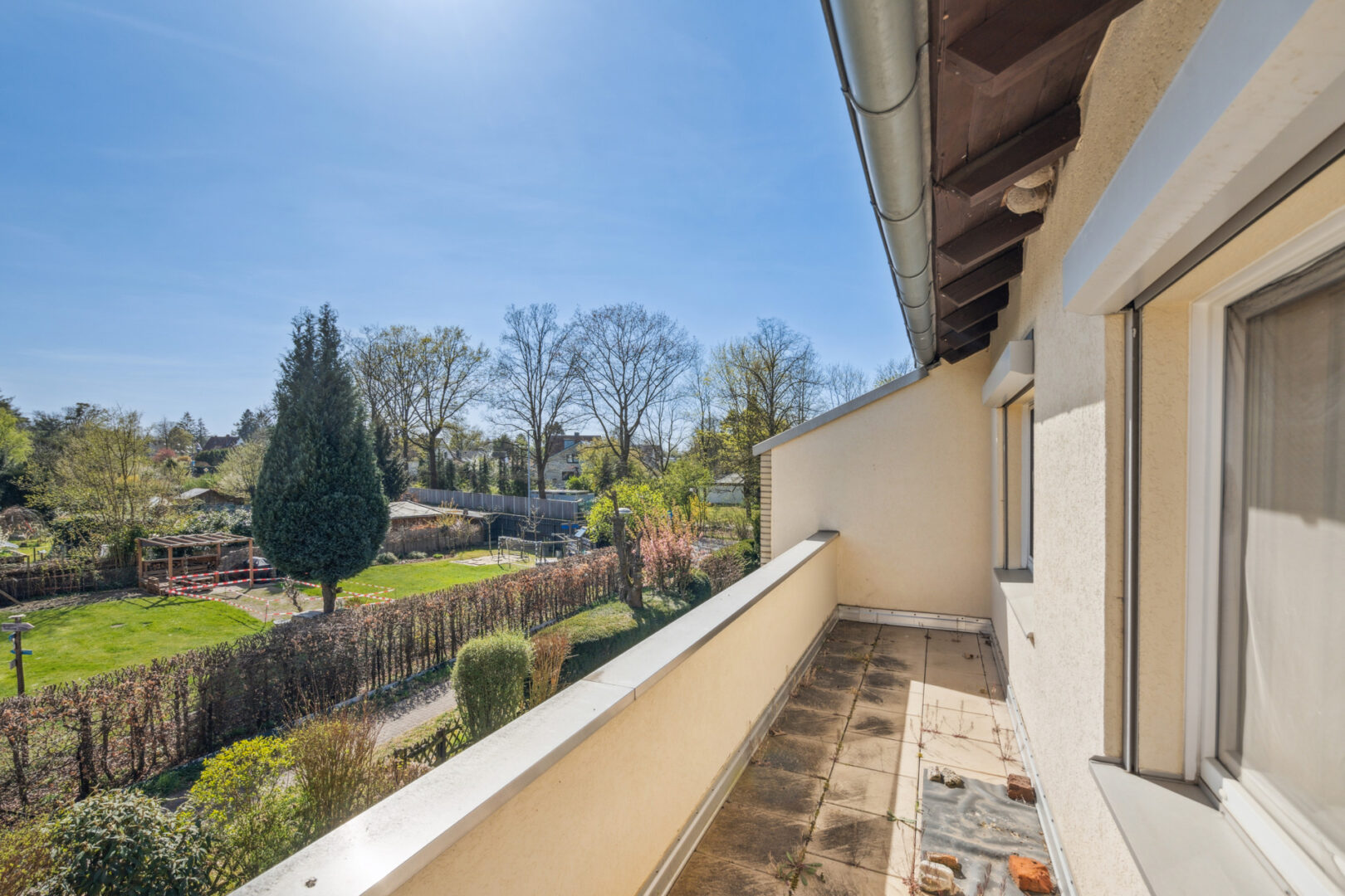 Im Obergeschoss befinden sich drei Zimmer sowie ein großzügiges Bad, das funktional ausgestattet ist, aber gestalterisch noch Raum für Modernisierungen bietet. Das Schlafzimmer verfügt über einen schönen Balkon mit Blick in die grüne Nachbarschaft. Die Etage ist vollständig ohne Dachschrägen, wodurch alle Räume optimal nutzbar sind. Zusätzlich steht Ihnen ein Spitzboden zur Verfügung.
