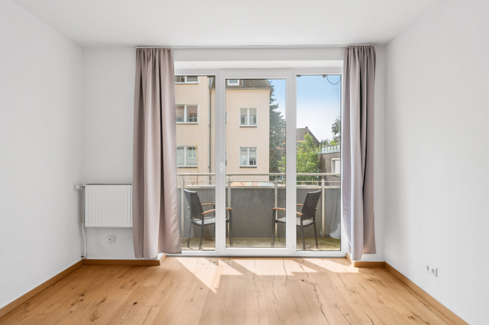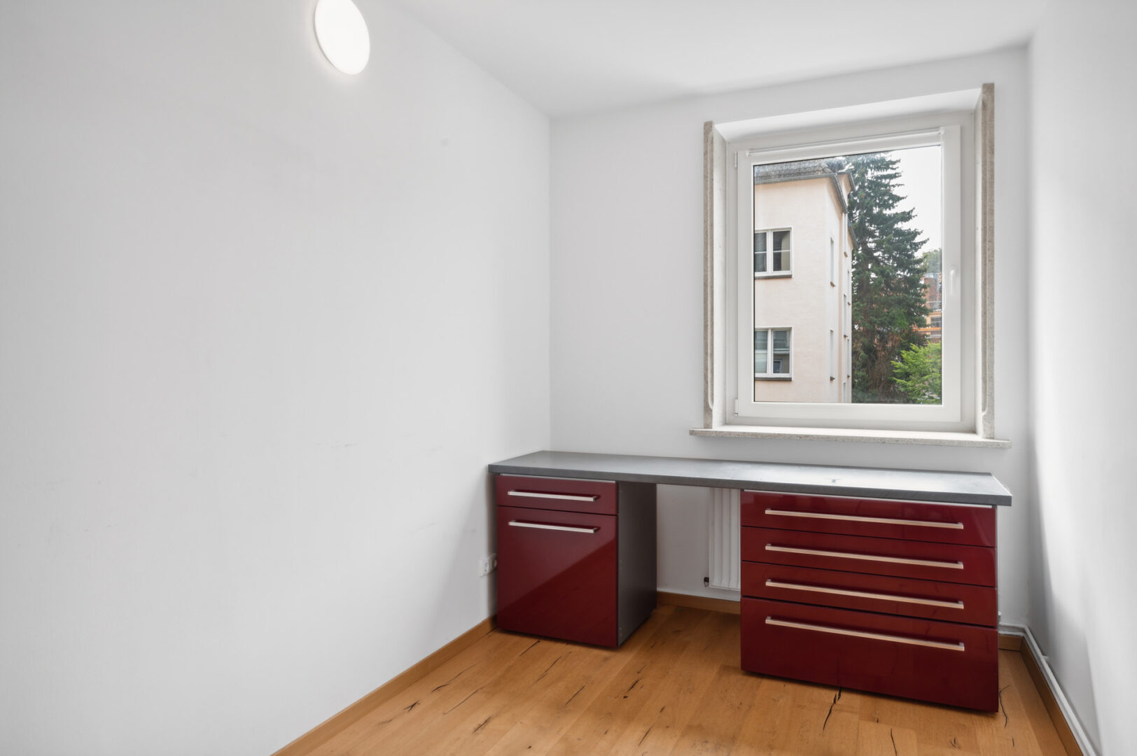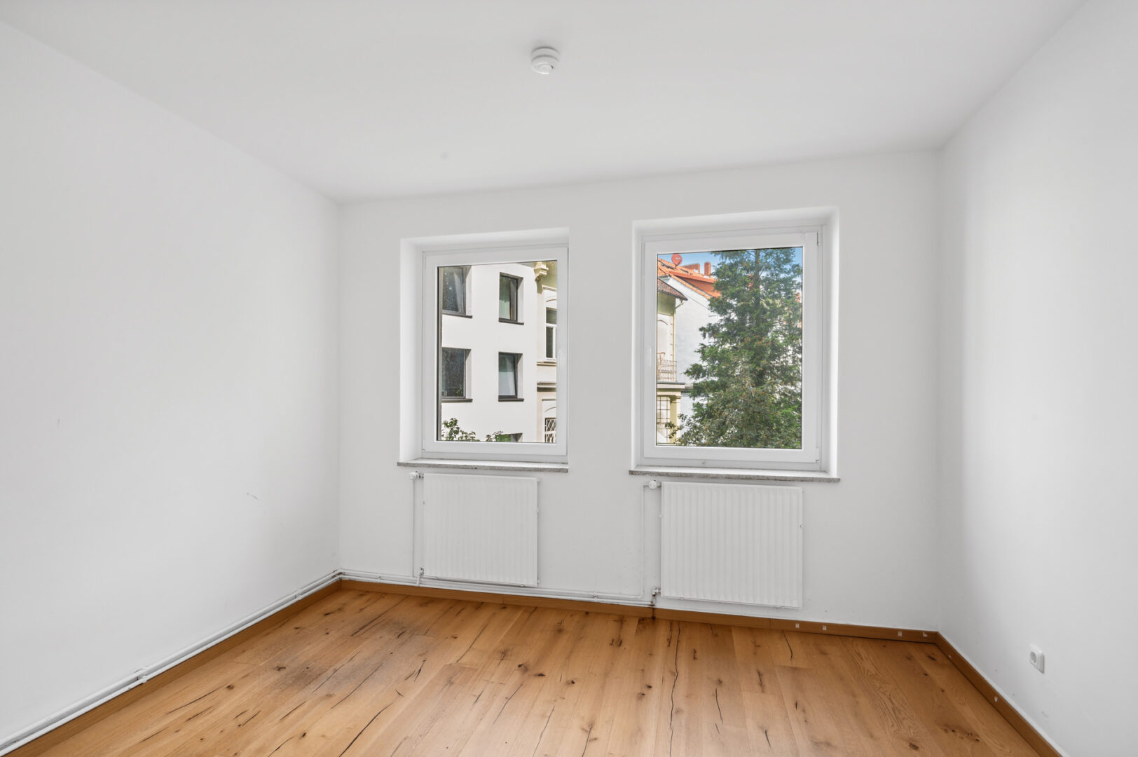 Am Ende des Flures liegen sowohl auf der linken als auch auf der rechten Seite jeweils ein Zimmer. Das linke Zimmer bietet sich als Schlafzimmer an, da es zum Innenhof ausgerichtet ist. Hier lassen sich ein großes Doppelbett sowie eine Kommode etc. mit Leichtigkeit platzieren.