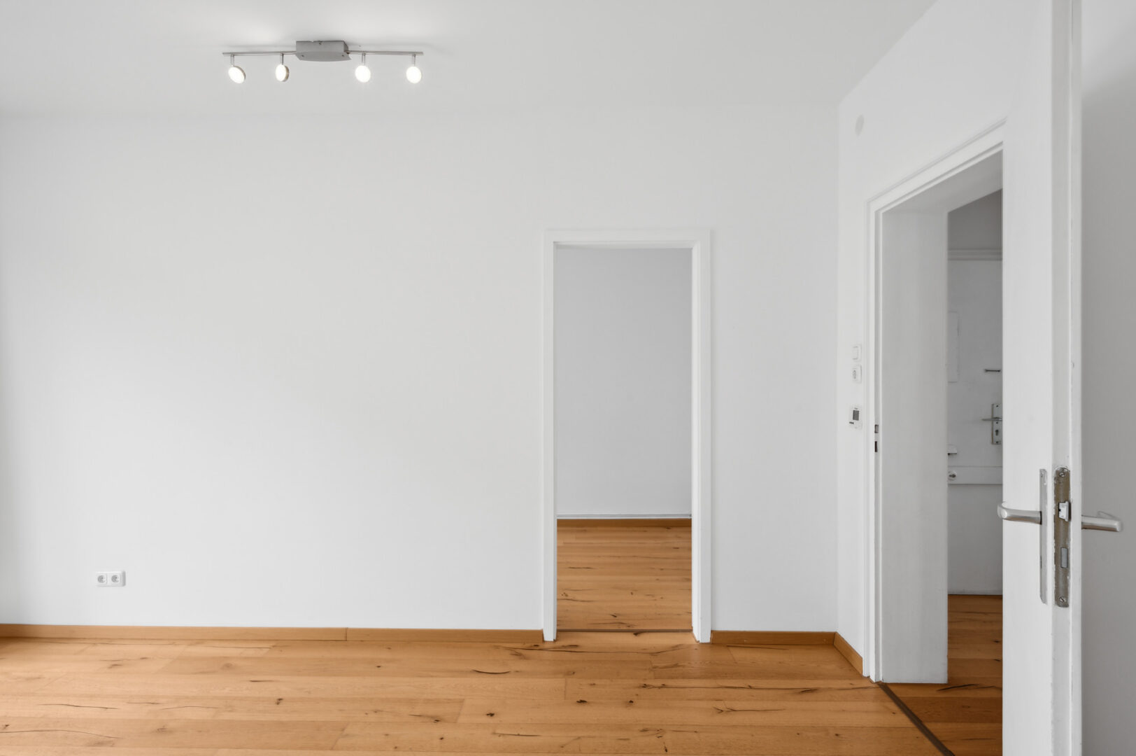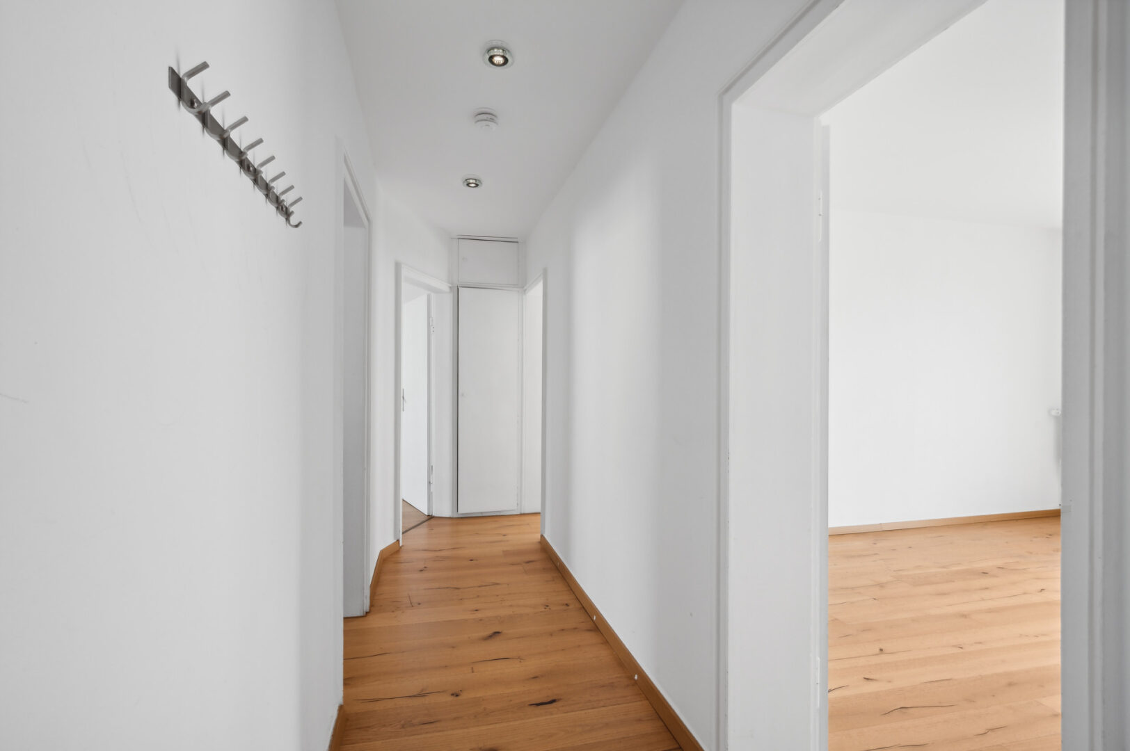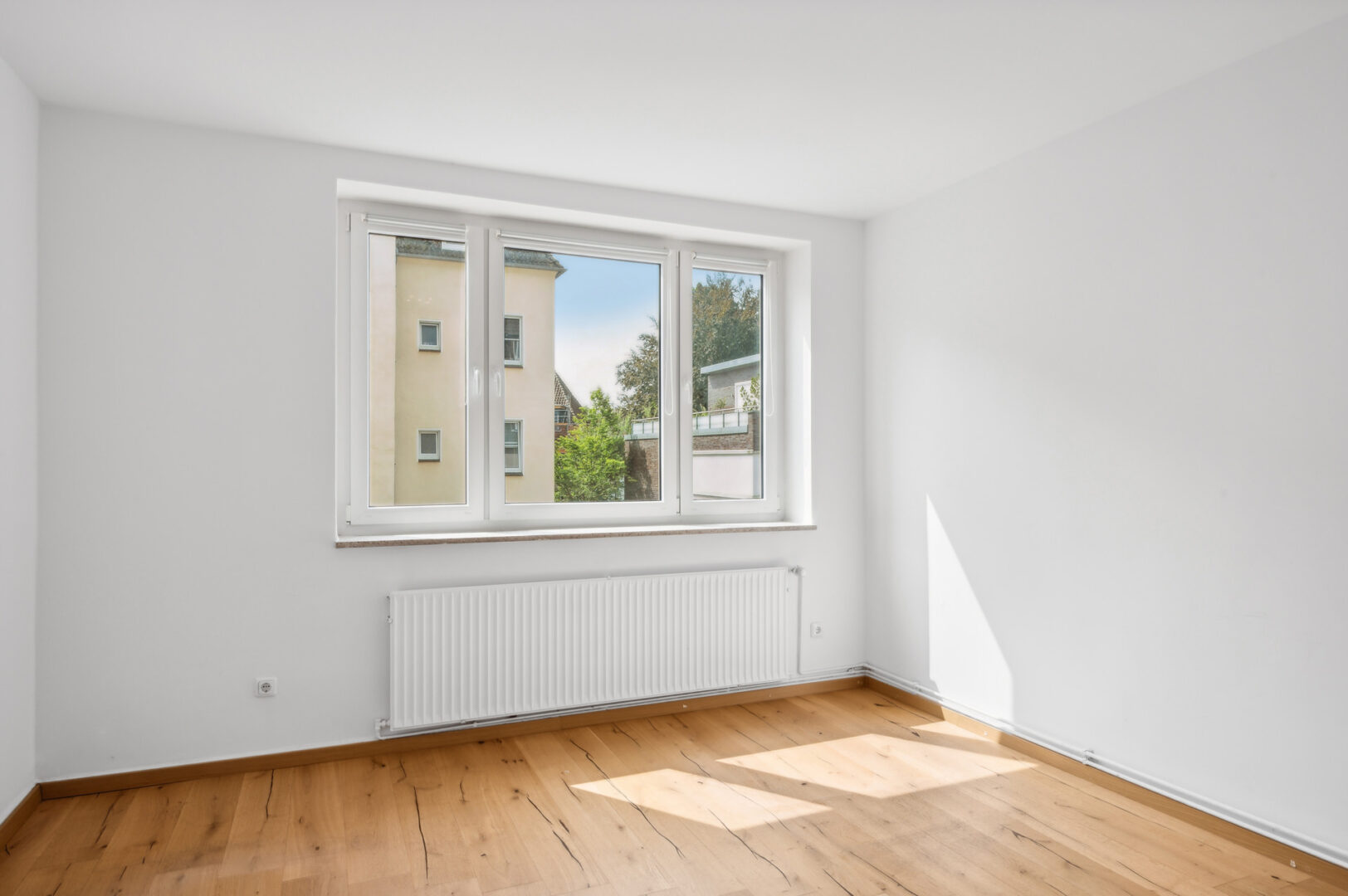 Am Ende des Flures liegen sowohl auf der linken als auch auf der rechten Seite jeweils ein Zimmer. Das linke Zimmer bietet sich als Schlafzimmer an, da es zum Innenhof ausgerichtet ist. Hier lassen sich ein großes Doppelbett sowie eine Kommode etc. mit Leichtigkeit platzieren.
