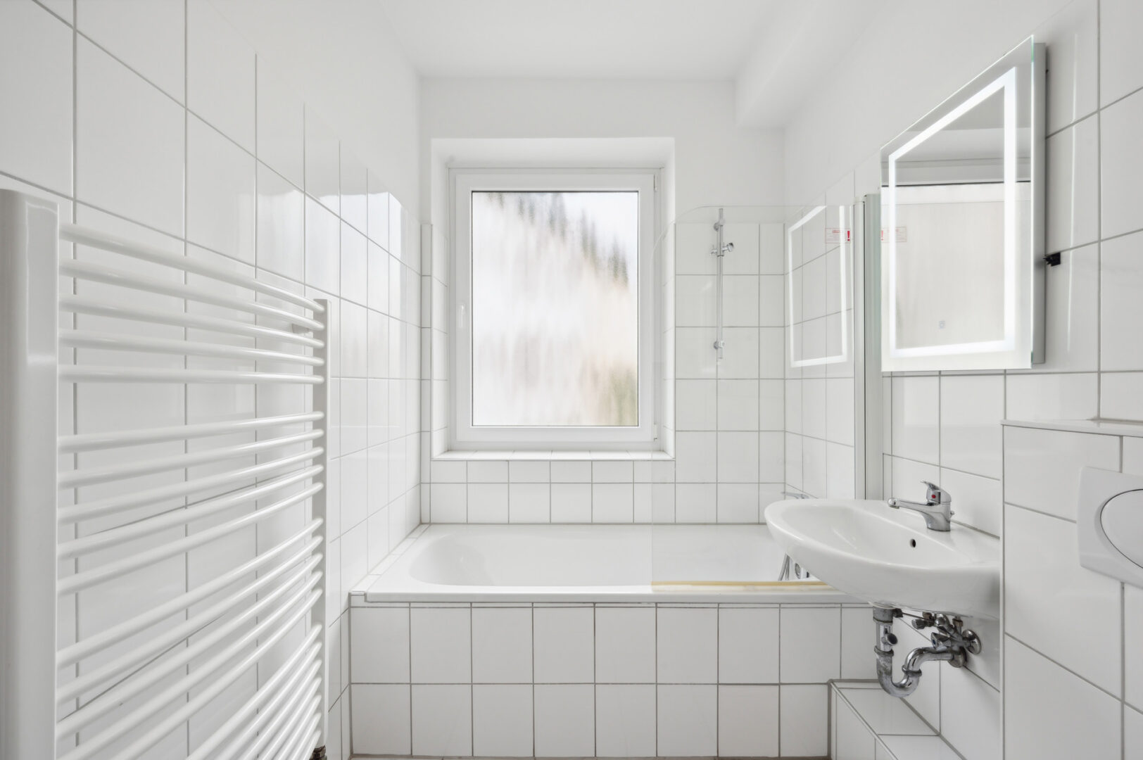 Das Tageslichtbadezimmer liegt am Anfang des Flures, links vom Eingang. Ausgestattet ist dieses mit einer großen Badewanne mit Duschfunktion, einem Waschbecken sowie dem WC. Ein großes Fenster sorgt auch hier für Tageslicht.