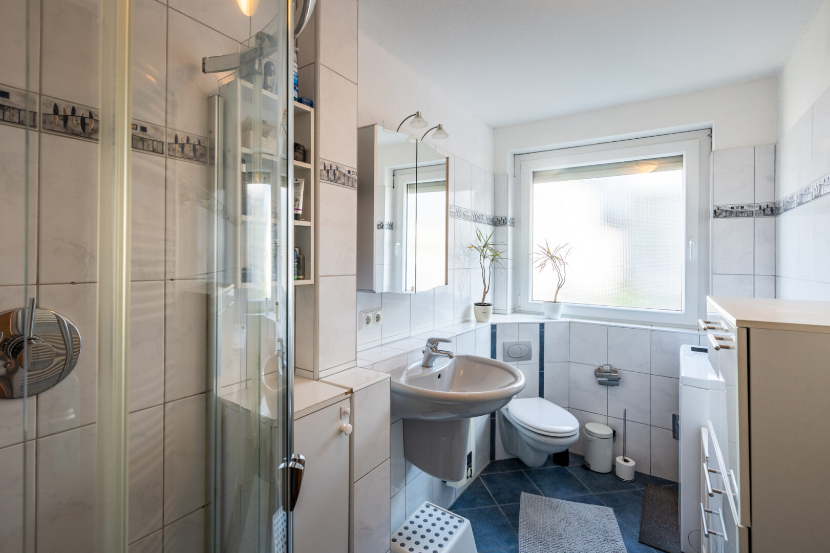 Nach dem Eintreten gelangen Sie in einen quadratisch geschnittenen Flur, der alle Räume miteinander verbindet. Rechter Hand befindet sich das gepflegte Badezimmer mit Dusche und Anschluss für eine Waschmaschine – funktional und praktisch für den Alltag. Direkt daneben liegt die Küche mit Platz für eine individuelle Gestaltung und gemütliche Kochrunden. Ein Fenster sorgt für Tageslicht und eine freundliche Atmosphäre beim Kochen.